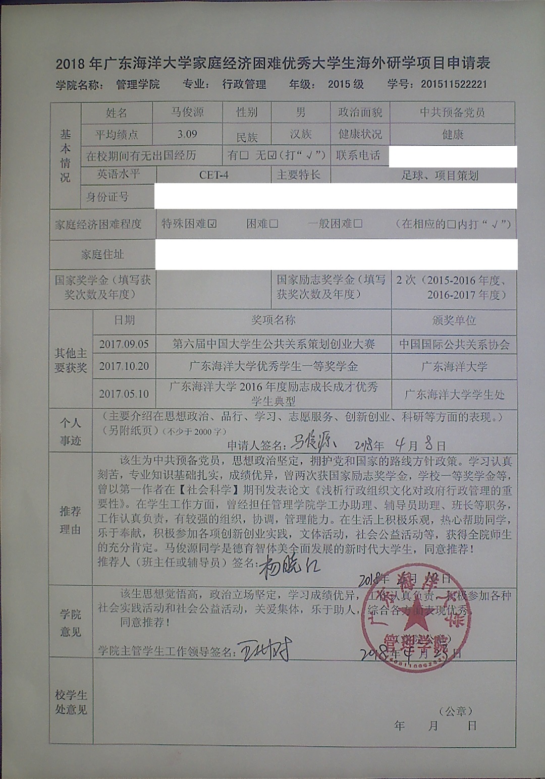 凭证《广东省教育厅关于开展2018年“助梦扬帆”资助高校家庭经济难题优异大学生外洋研学事情的通知》(粤教助函[2018]16号)文件精神,,经学生自己申请,,各学院推荐,,学生随处务聚会讨论,,专家组综合评议并面试,,拟报送南宫NG28集团治理学院行政治理专业1152     班马俊源同砚为加入2018年度“助梦扬帆”外洋研学项目候选人,,现将有关情形予以公示。。。若有异议,,请在公示期内实名向学生处反映,,并提供联系方式,,否则不予受理。。。